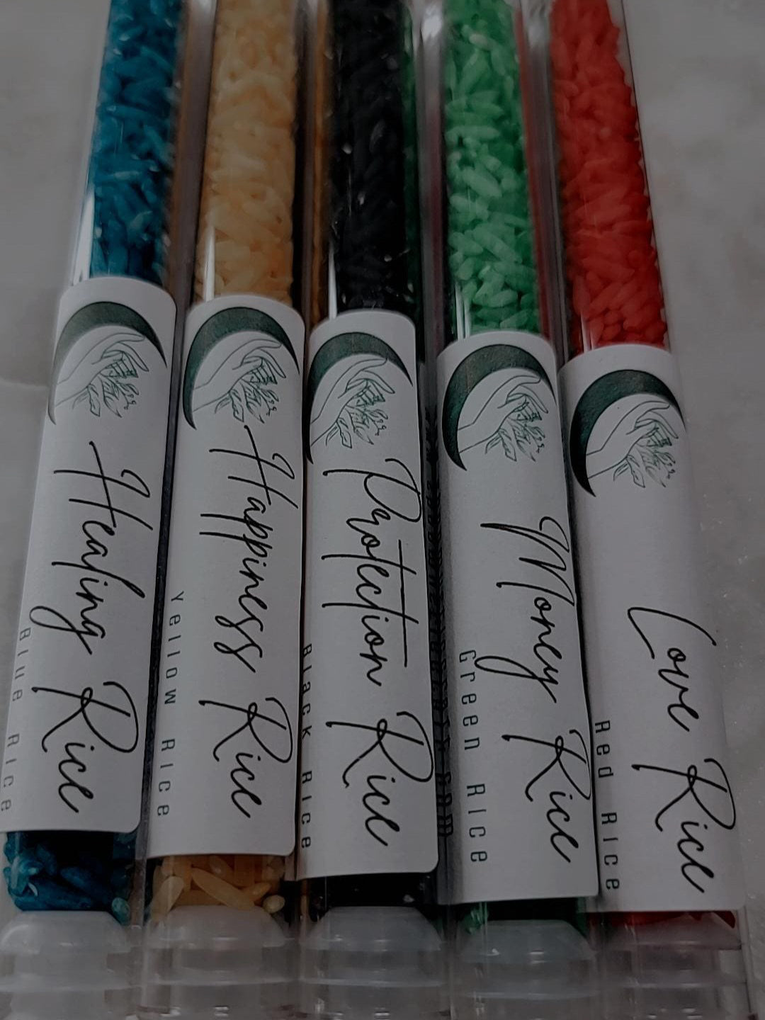 Each vial is approximately 0.5 to 1 ounce and contains one variety of rice. These varieties include Green Rice (Money), Yellow Rice (Happiness), Red Rice (Love), Blue Rice (Healing), and Black Rice (Protection). The energy of rice is strongly associated with the Earth element and the sun, and is said to be feminine in nature.