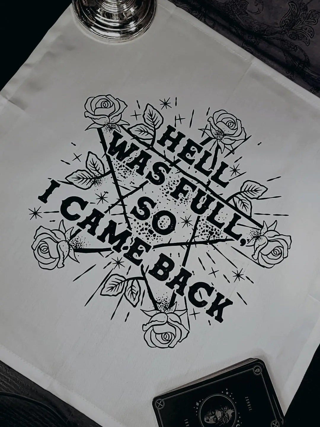 Create a unique look for your altar space with this 18x18 inch Cotton/Polyester blend cloth. Highly absorbent with a black print on a white background, it provides the perfect way to decorate and personalize. Machine wash only; hang dry. Do not iron.