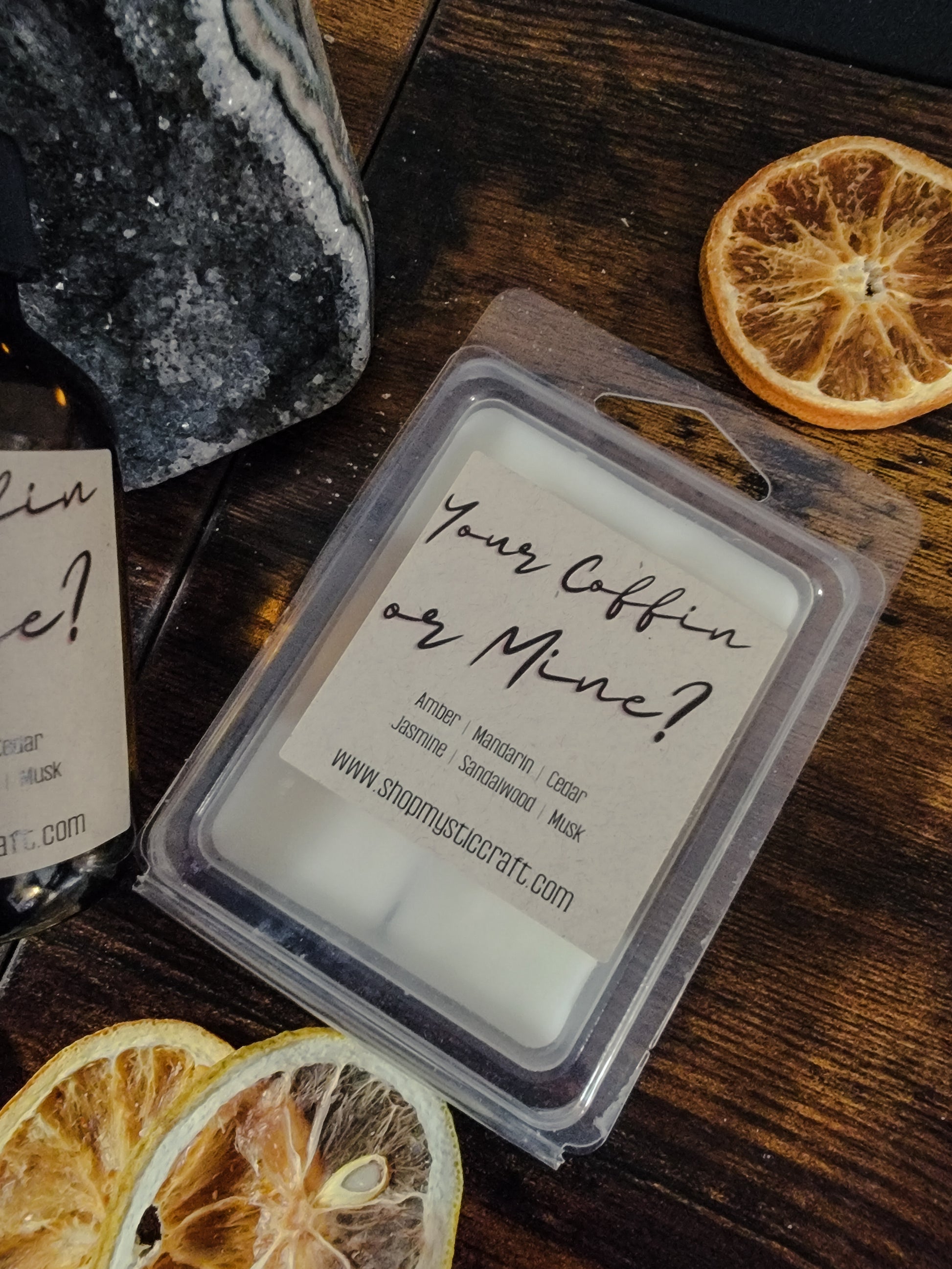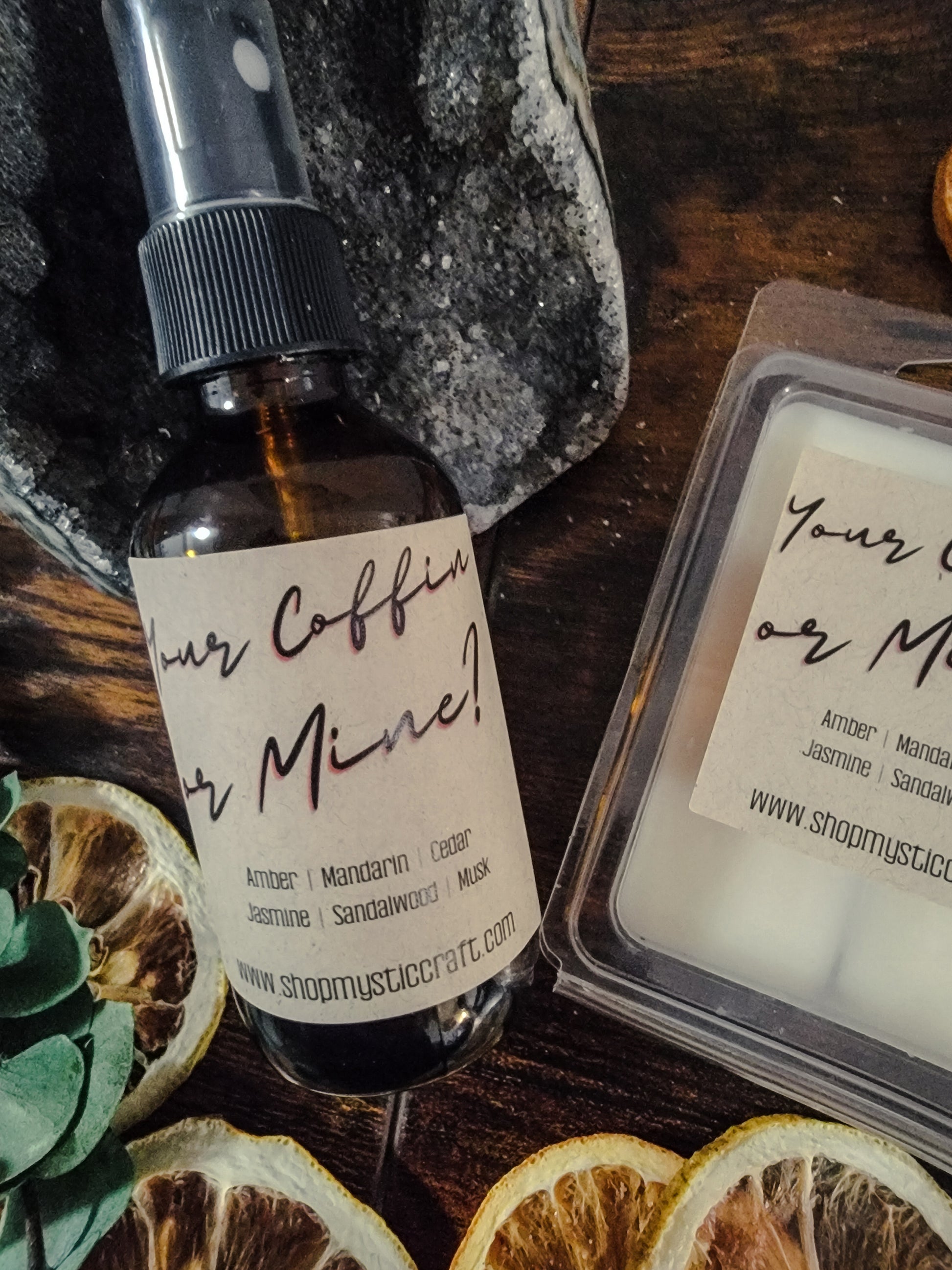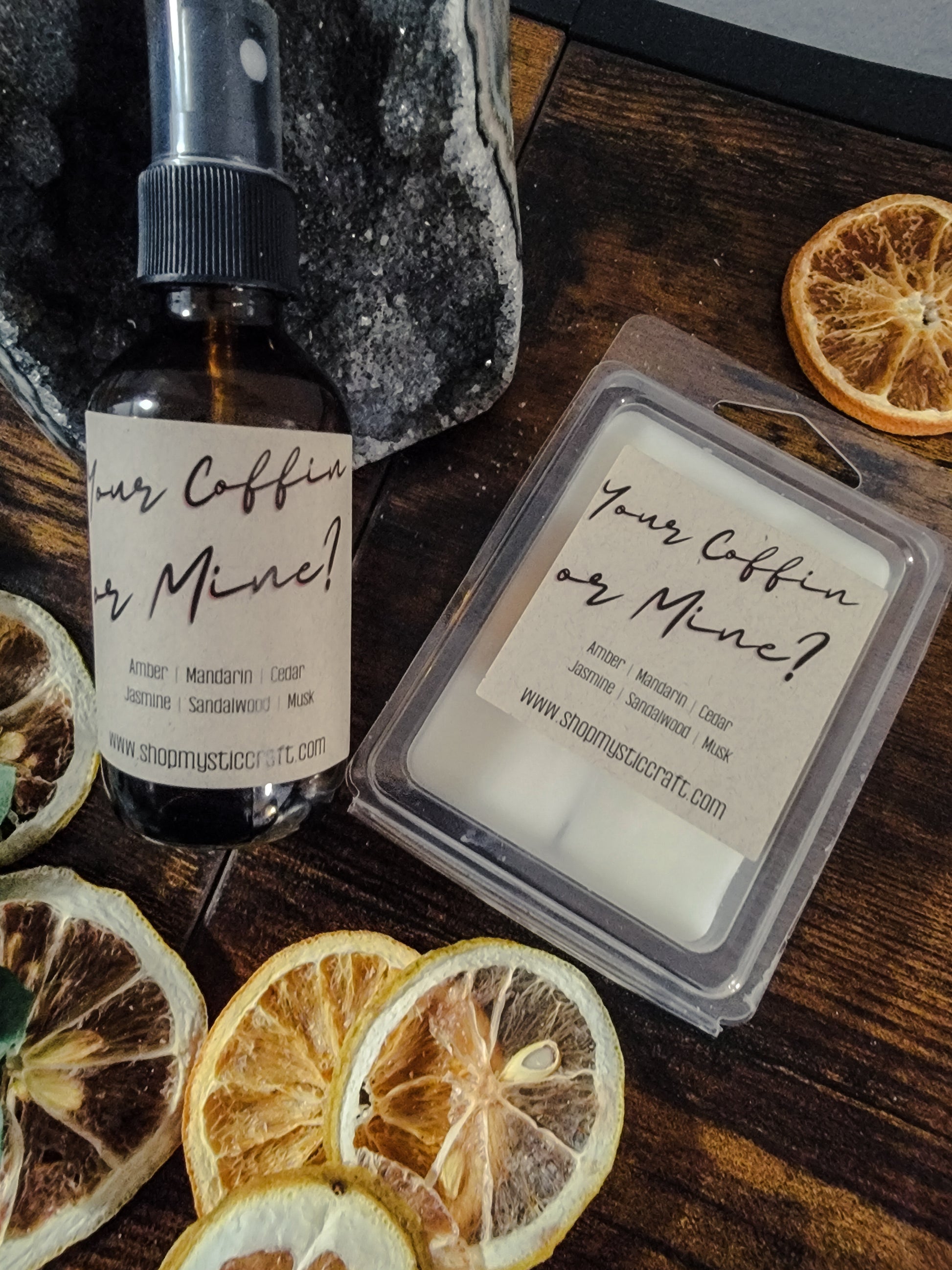 Introducing "Your Coffin or Mine?" room spray - a captivating blend that embraces the dark allure of mystery and romance. Immerse yourself in the intoxicating aroma of amber, mandarin, cedar, jasmine, sandalwood, and musk, conjuring an ambiance that is both enchanting and seductive. Experience the rich warmth of amber and the vibrant citrus notes of mandarin, dancing in harmony with the woody embrace of cedar and sandalwood. Allow the sensual essence of jasmine to intoxicate your senses, while the lingering musk adds an intriguing touch. With each spritz of "Your Coffin or Mine?", transform your space into a sanctuary that exudes a sultry and mysterious atmosphere. Embrace the allure of the shadows and let this captivating scent enshroud you in its alluring embrace.