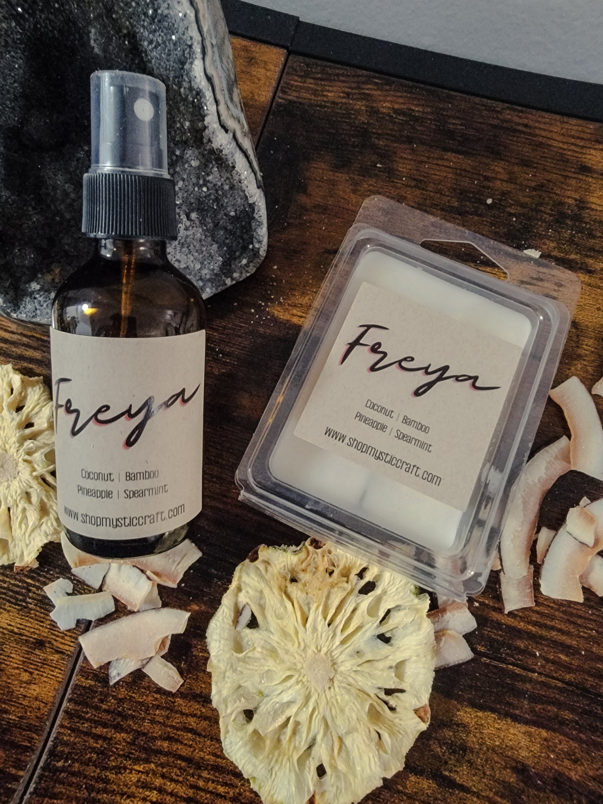 A bewitching blend that pays homage to the captivating Norse goddess of love, beauty, and magic. Immerse yourself in the alluring aroma of coconut, bamboo, pineapple, and spearmint, carefully crafted to embody the essence of Freya's enchanting presence.