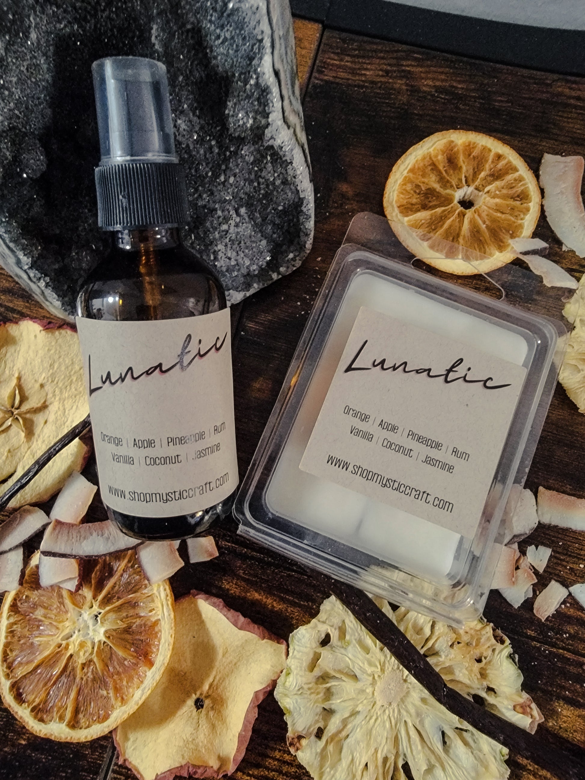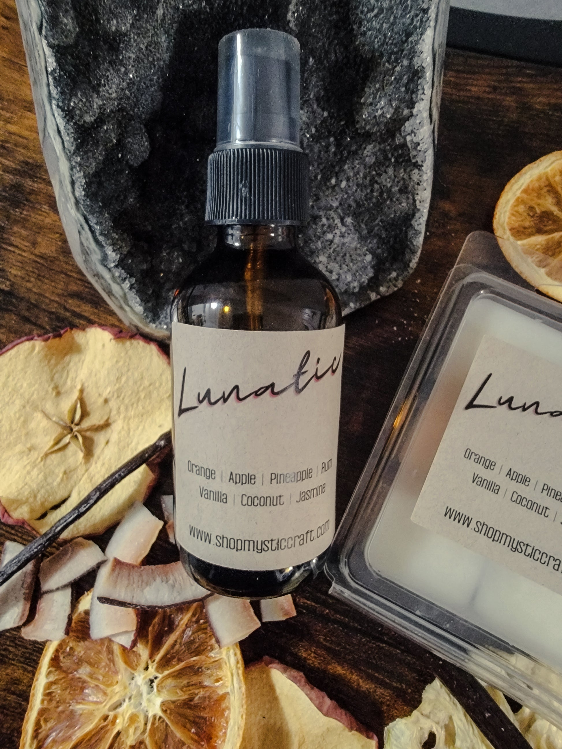 Introducing Lunatic Room Spray: a captivating blend of orange, apple, pineapple, rum, vanilla, coconut, and jasmine. Transform any space into a tropical oasis with this invigorating and intoxicating fragrance. Experience the magic of Lunatic and indulge in its delightful aroma.
