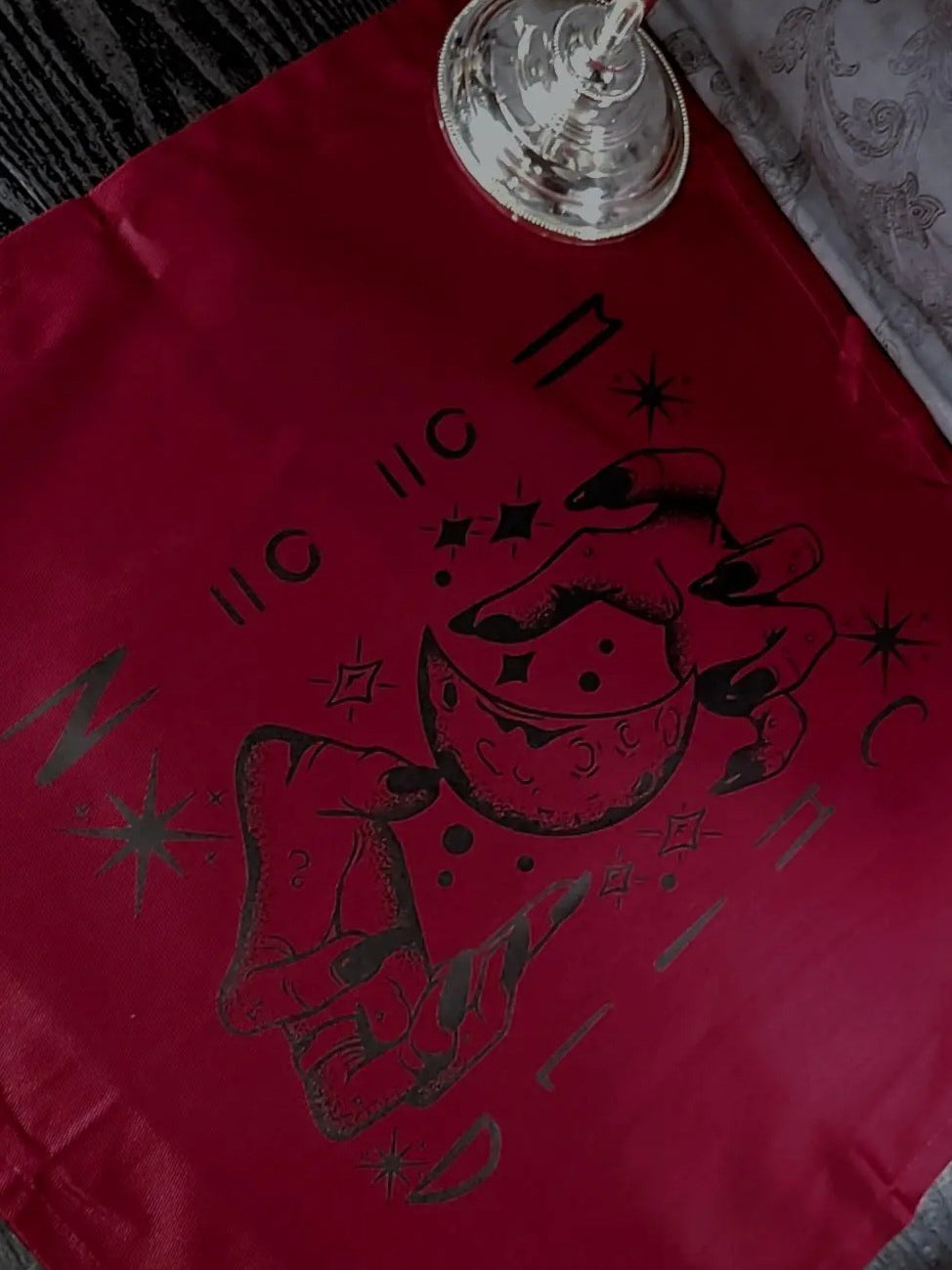 Create a unique look for your altar space with this 18x18 inch Cotton/Polyester blend cloth. Highly absorbent with a black print on a burgundy background, it provides the perfect way to decorate and personalize. Machine wash only; hang dry. Do not iron.
