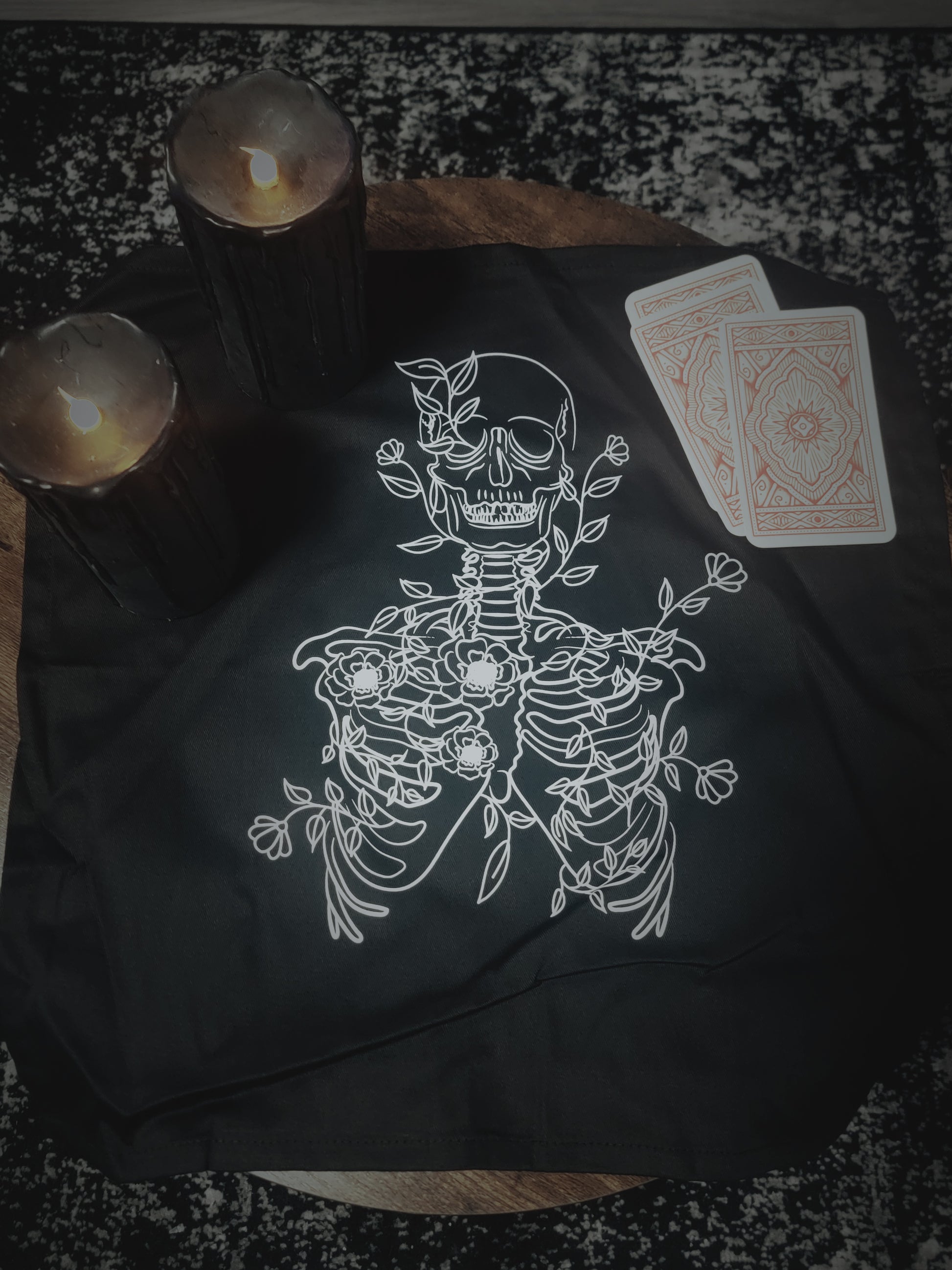 Create a unique look for your altar space with this 18x18 inch Cotton/Polyester blend cloth. Highly absorbent with a white print on a black background, it provides the perfect way to decorate and personalize. Machine wash only; hang dry. Do not iron.