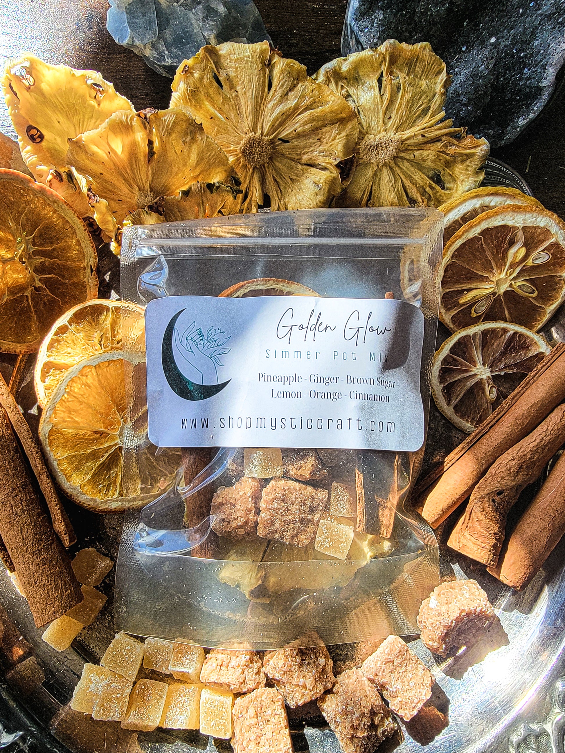 Bask in the warm, radiant energy of Golden Glow, a simmer pot blend crafted for joy, vitality, and abundance. Infused with pineapple, ginger, brown sugar, lemon, orange, and cinnamon, this golden-hued blend fills your space with warmth and positive energy.