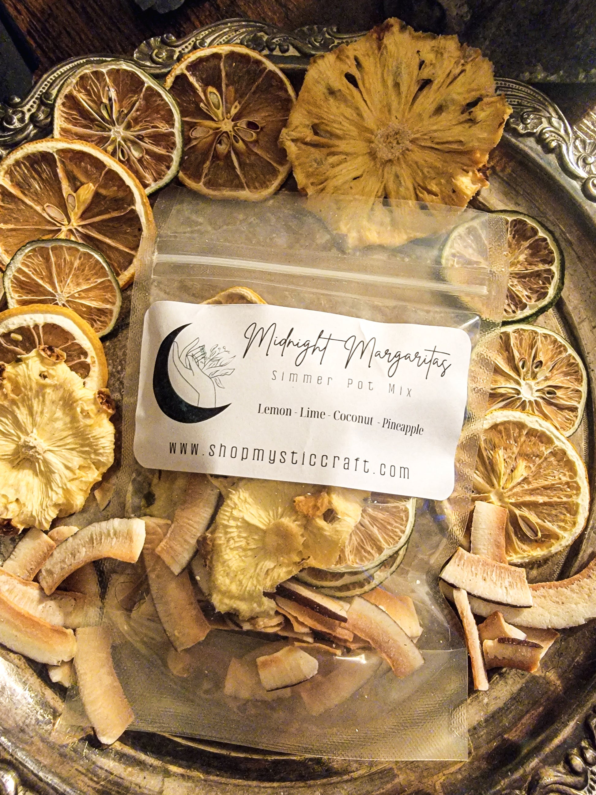 Brew a little magic in your home with Midnight Margaritas, a tropical-inspired simmer pot blend that stirs up enchantment and good vibes. Infused with pineapple, coconut, lemon, and lime slices, this fragrant blend will transport you to a moonlit beach, where spells are whispered over salt-rimmed glasses.