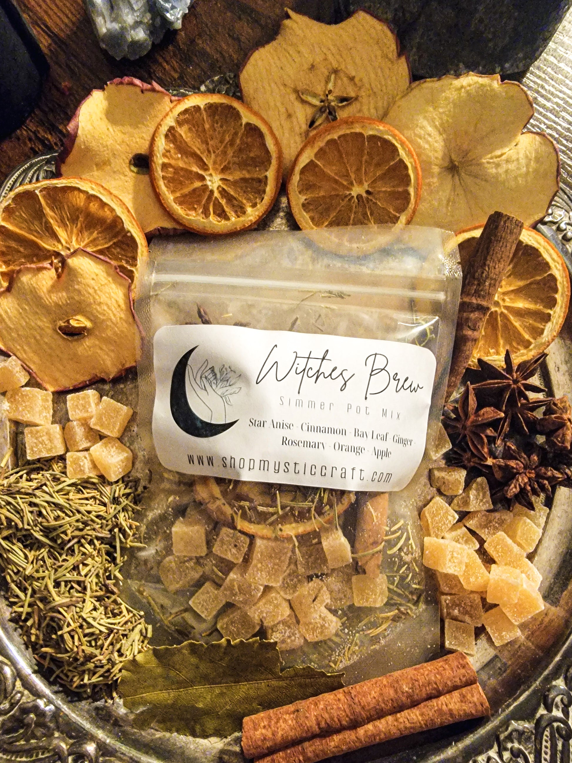 Stir up some magical warmth with Witches Brew, a potent simmer pot blend crafted for protection, manifestation, and enchanting energy. Infused with star anise, cinnamon, bay leaf, rosemary, orange, apple, and ginger, this blend combines the perfect balance of spices and sweetness to invoke power and transformation.
